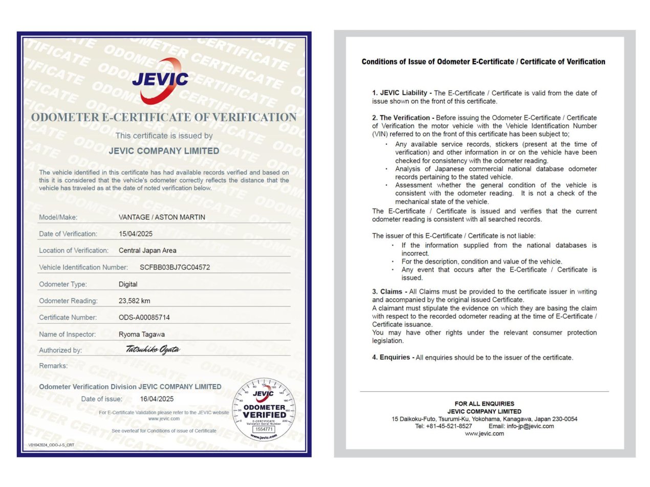 Dit exemplaar is nieuw geleverd door Cornes in Japan, alwaar zij de officiele importeur zijn van dit Britse merk. Zoals wel bekend zijn de Japanse auto's gemiddeld in ongekend goede conditie en de V8 Vantage die wij hier aanbieden is hiervan een perfect voorbeeld. U koopt eigenlijk een nieuwe auto! Om zeker te zijn van een kloppende kilometerhistorie, hebben wij de Japanse versie van de Nationale Autopas aangevraagd. Dit JEVIC Odometer E-certificate is het bewijs dat de kilometerstand bij dit voertuig 100% correct is.