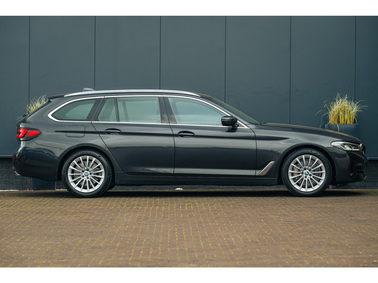 In het tijdloze Sophisto Grau metallic en afgewerkt met 18 inch Multispaak wielen, aluminium raamlijsten en dakrails heeft deze 5-Serie een chique uitstraling. In 2021 is deze prachtige BMW 5-Serie nieuw door ons zusterbedrijf besteld en in die 4 jaar is er slechts één berijder geweest. Met recht een eerste eigenaars auto dus. De BTW is nog verrekenbaar en en het onderhoud is telkens tijdig uitgevoerd. Indien gewenst is er een set lichtmetalenvelgen met winterbanden beschikbaar voor overname.