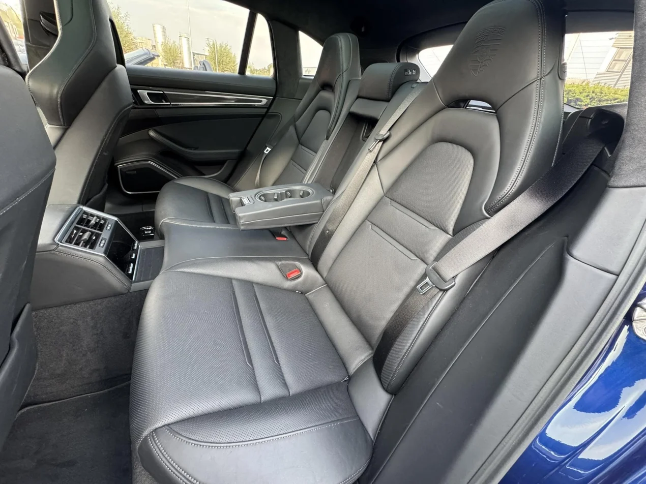 De kleur Gentiaan Blauw metallic benadrukt de elegante lijnen en sportieve proporties van de Sport Turismo. Binnenin verwelkomt het zwarte nappa-leder u met prachtige details zoals het Porsche 'crest' op alle 4 hoofdsteunen en "Panamera 4S" op de middenarmsteun. Stuk voor stuk kleine details, die het geheel aan elkaar rijgen. De hemelbekleiding is uitgevoerd in antraciet alcantara voor het ultieme cockpit-gevoel. De BOSE geluidsinstallatie is voorzien van het uitgebreide pakket LED-interieurverlichting dat in vele kleuren is te schakelen. Elk detail – van de afwerking tot de ergonomie – straalt Porsche-perfectie uit.